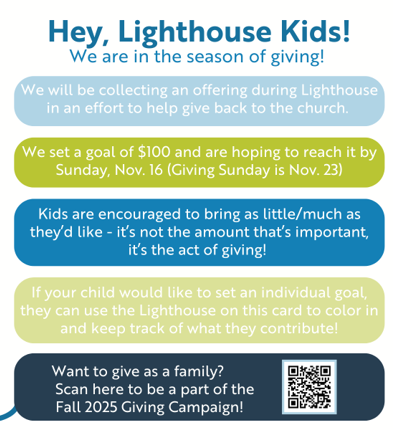 Our 2nd Annual “Lighthouse Giving Challenge” has returned! Just like last year, our Lighthouse Kids are encouraged to do chores around the house, neighborhood, etc., and give a portion of their earnings to the church on Sunday mornings. Much like in “big church” in the sanctuary, we will pass around a box each Sunday for kiddos to drop coins and bills into. We have reminded them that God gives to us in so many ways, it feels great to give back to God! We have set our goal at $100 by November 16 and are tracking our progress each week with the Lighthouse on the stairwell landing. Remind your kiddos to bring their coins on Sunday mornings!