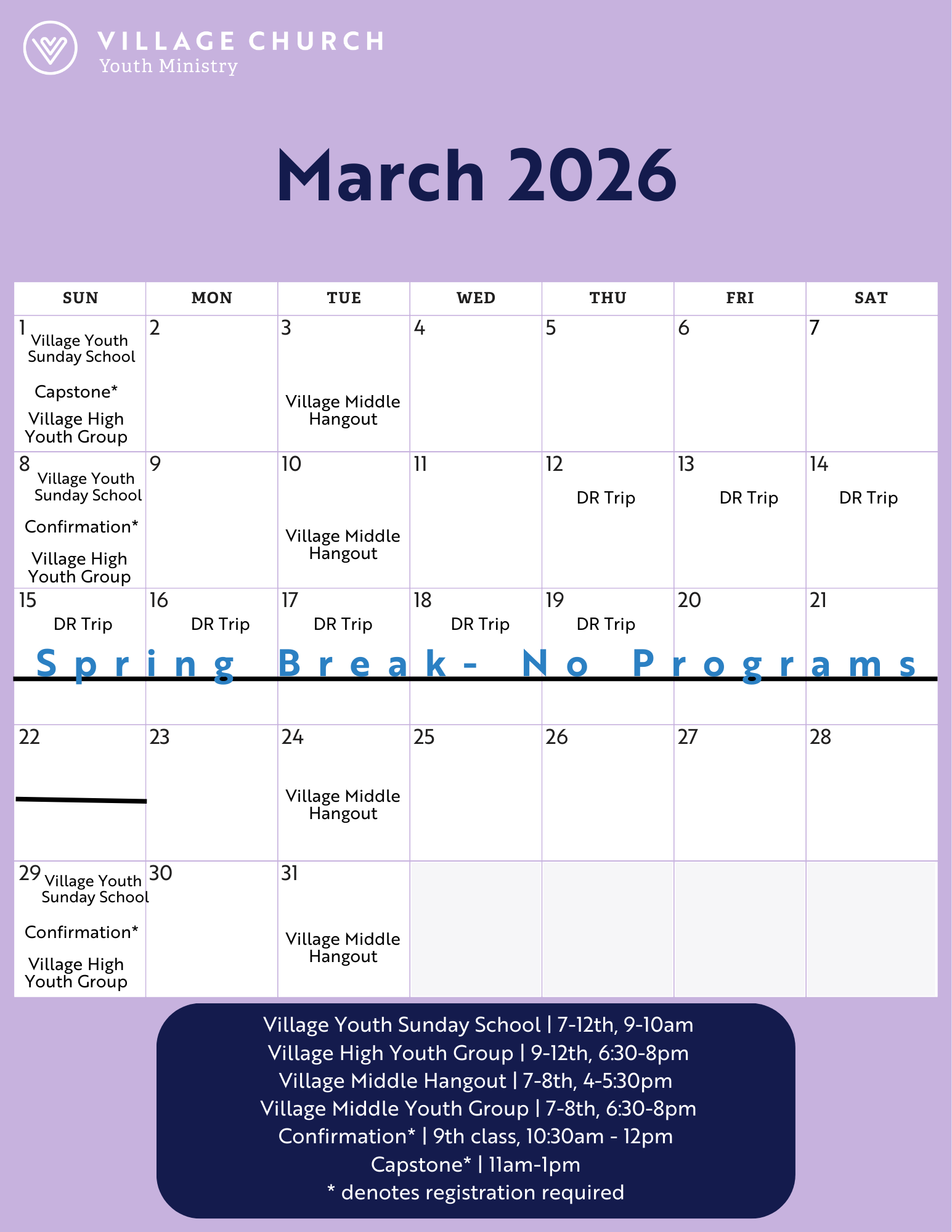 Village U: Summer Strategies for College Admissions-6pm Thursday, Feb. 5, Room 132, Mission Campus. Vicki Petersen, VP College Consulting, will work with 9-12th grade students and their parents to design a meaningful, authentic summer that you’ll enjoy, while helping you grow and strengthen your college applications. Please register here- https://villagepres.churchcenter.com/registrations/events/3329063