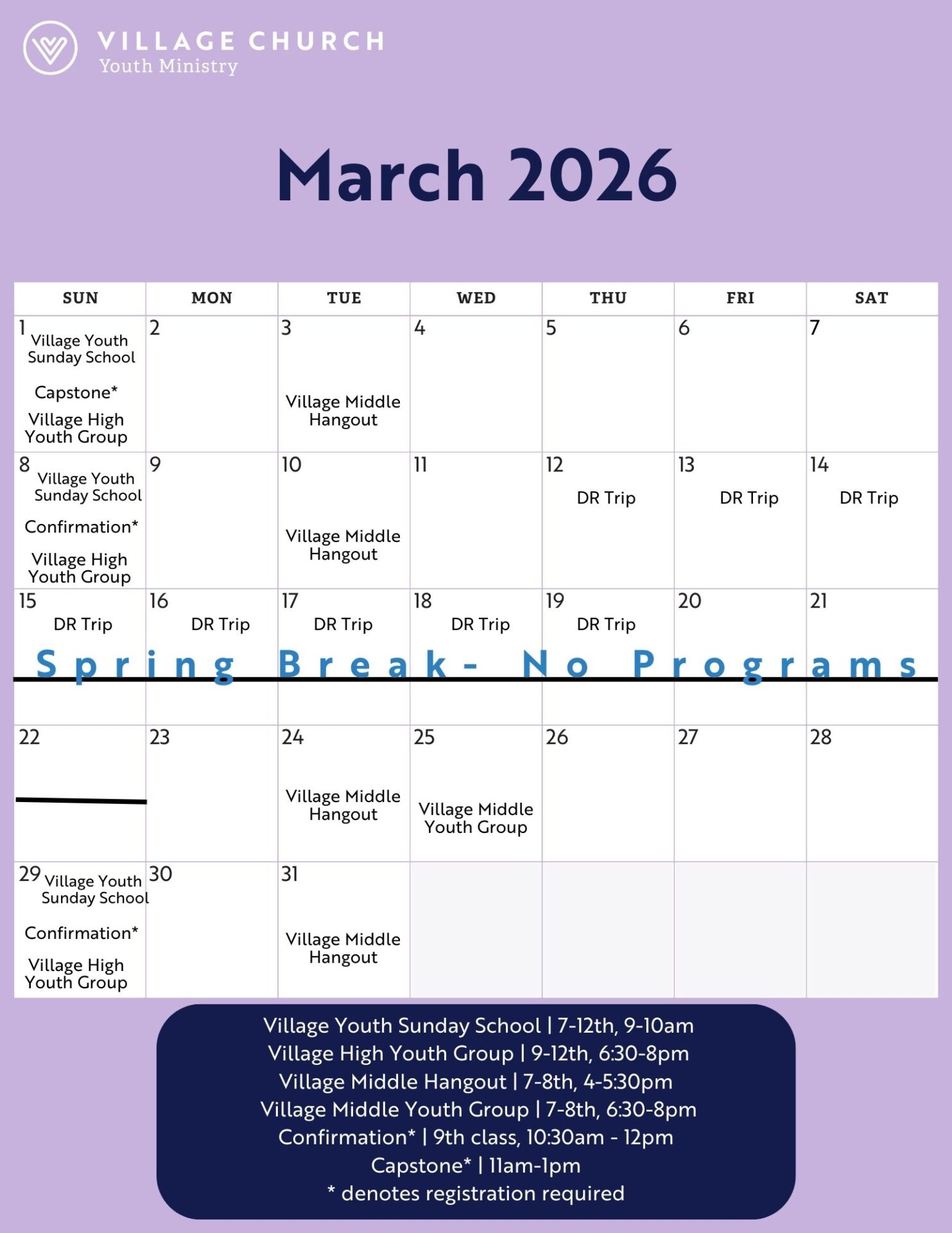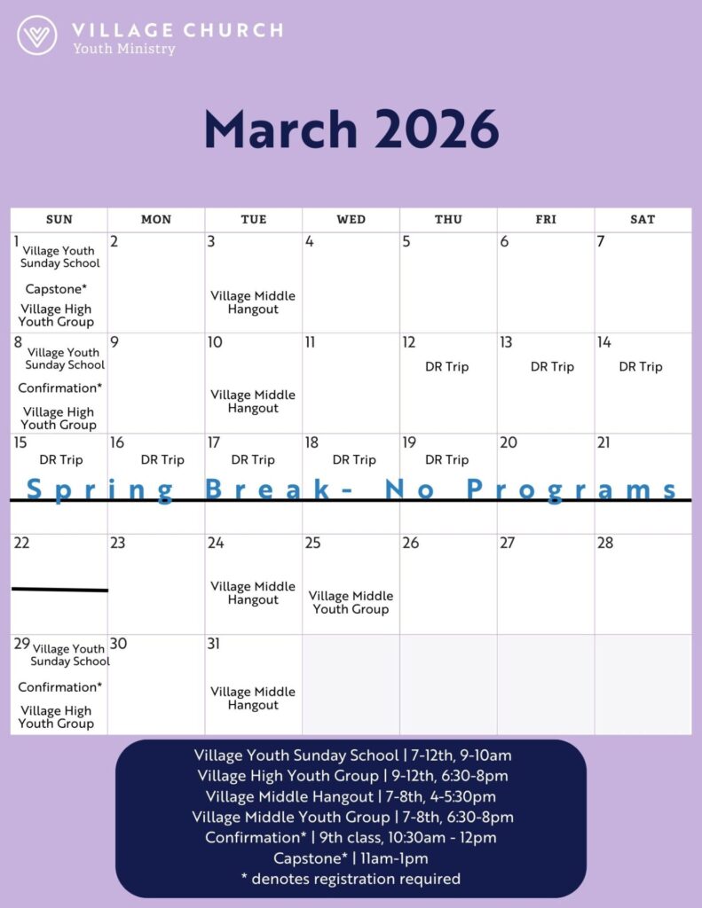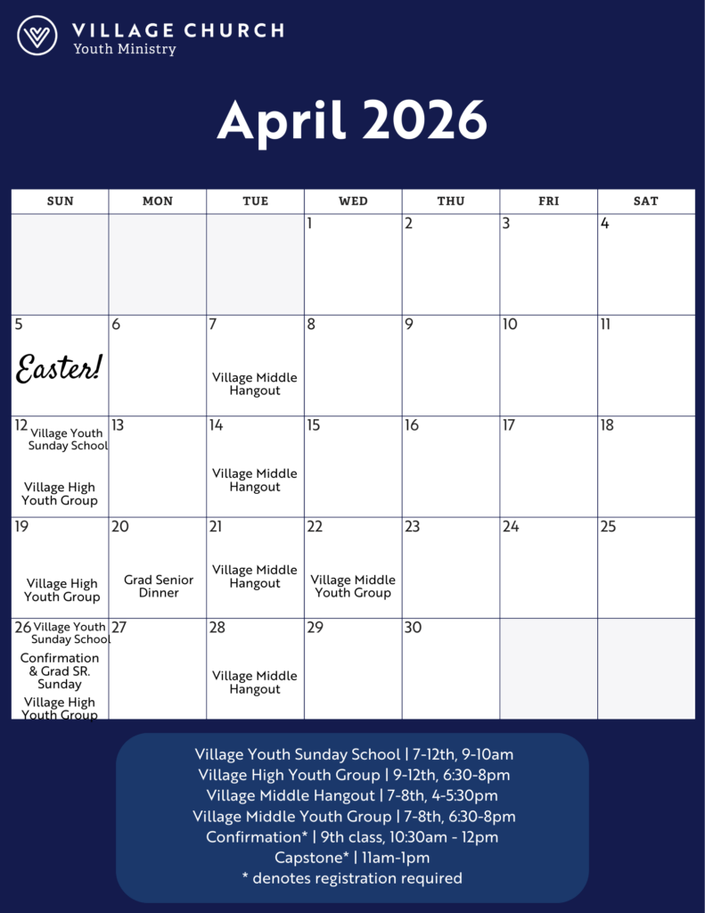 - March 25 – Village Middle Youth Group as we wrap up the Lenten season together