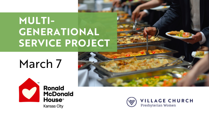 Serve at Ronald McDonald House – 10:30 a.m.-1:30 p.m. Saturday, March 7, Ronald McDonald House. This is a service project for all ages! We’ll be preparing and serving lunch for inpatient families (for 40-50 people). Space is limited so register soon. We’ll be at two locations: The Longfellow House, 2502 Cherry, KC, MO and the Ronald McDonald Family Room—Children’s Mercy, 2401 Gillham Road, KC, MO (inside Children’s Mercy Hospital on the 2nd floor). Groups will be assigned and detailed info will be emailed to you before March 7. Bring your children, a friend, your spouse, or a neighbor; this is a multi-generational opportunity for men and women to serve others. All are welcome!