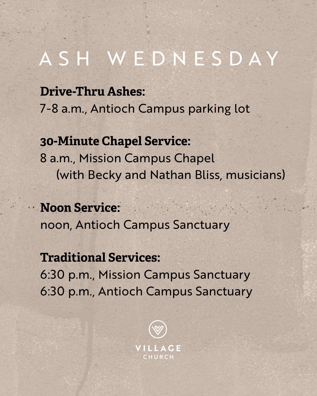 Village Connect Group – 6:30-8 p.m. Wednesdays, March 4-25, Room 124 (Mission Campus). Participate in this year’s Beatitudes Bible study created by Pastor Rodger. Email Carol Solenberger.
