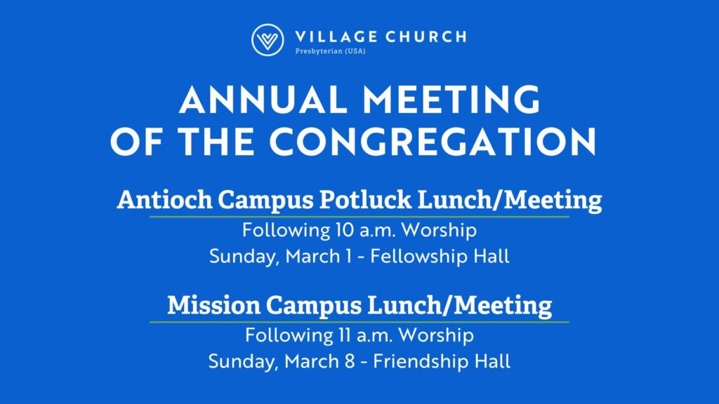 Plan to stay after the 10 a.m. worship service on Sunday, March 1 (Antioch), and after the 11 a.m. service on Sunday, March 8 (Mission). Congregations at both campuses will share lunch while we reflect on our ministry in 2025, hear a report about the 2026 budget, and our plans for the capital campaign.