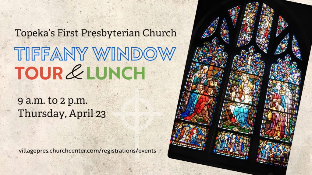 Tiffany Stained Glass Window Tour & Lunch – 9 a.m. Thursday, April 23. See the nation‘s largest church collection of Tiffany glass windows at First Presbyterian Church in downtown Topeka. After a docent-led tour, we’ll share lunch together. Find more info and register HERE.