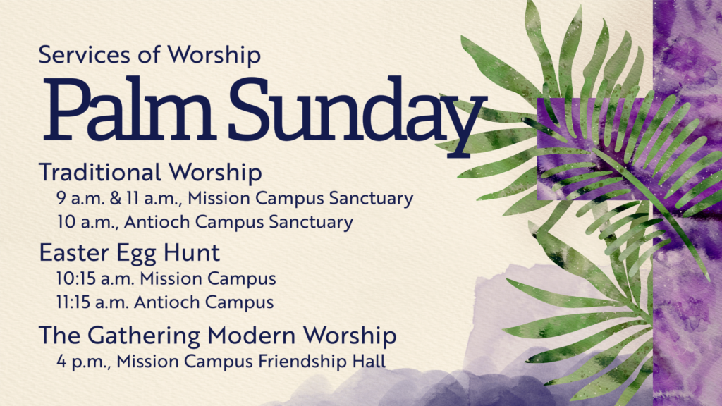 Palm Sunday Parades & Egg Hunts – All kids are welcome to join the annual Palm Sunday Parades on March 29 during the 9 a.m. (Mission) and 10 a.m. (Antioch) worship services—followed by Easter Egg Hunts at both campuses.