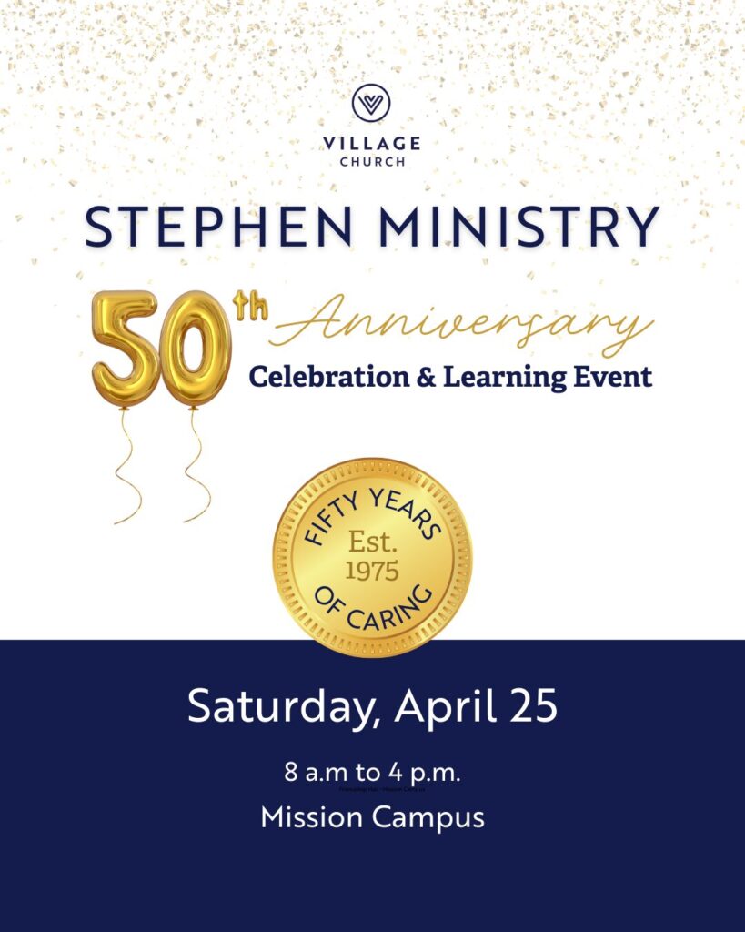 Stephen Ministry 50th Anniversary Celebration and Learning Event – this Saturday, April 25 (Mission Campus). All those whose lives have been touched by Stephen Ministry are invited to celebrate a five-decade anniversary with speakers, resources, and more. The event, which includes a light breakfast and refreshments, is $15 per person. Register HERE.