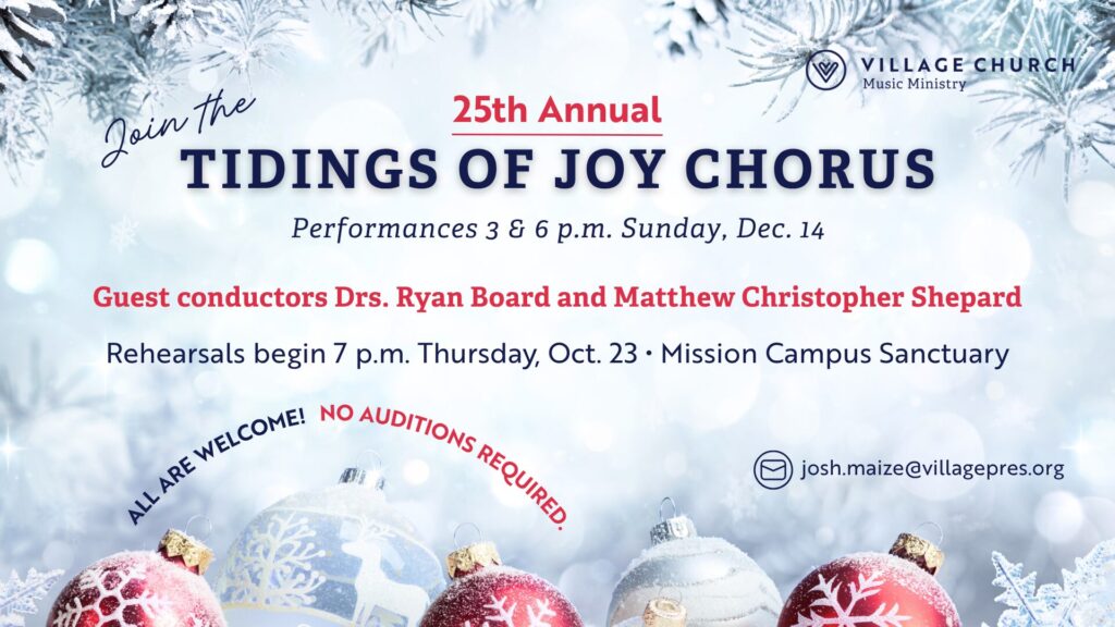 Tidings of Joy will be Dec. 14 and to celebrate the 25th anniversary, we have a very special concert in store. Rehearsals begin Thursday, Oct. 23. Contact Dr. Joshua Maize to sign up. Add your voice to the chorus!
