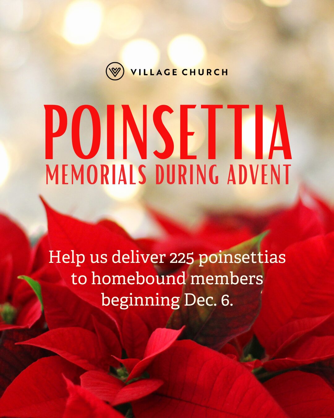 Remember a loved one AND brighten someone‘s day! – A $15 poinsettia donation does two things: a homebound member receives a poinsettia from their Village family and your loved one(s)’ name(s) will be in the Christmas Eve bulletin. Donate HERE or send the name(s) with a check ($15 per person) to Karen Reimer, Village Presbyterian Church, 6641 Mission Rd., Prairie Village, KS 66208 by Tuesday, Dec. 2.